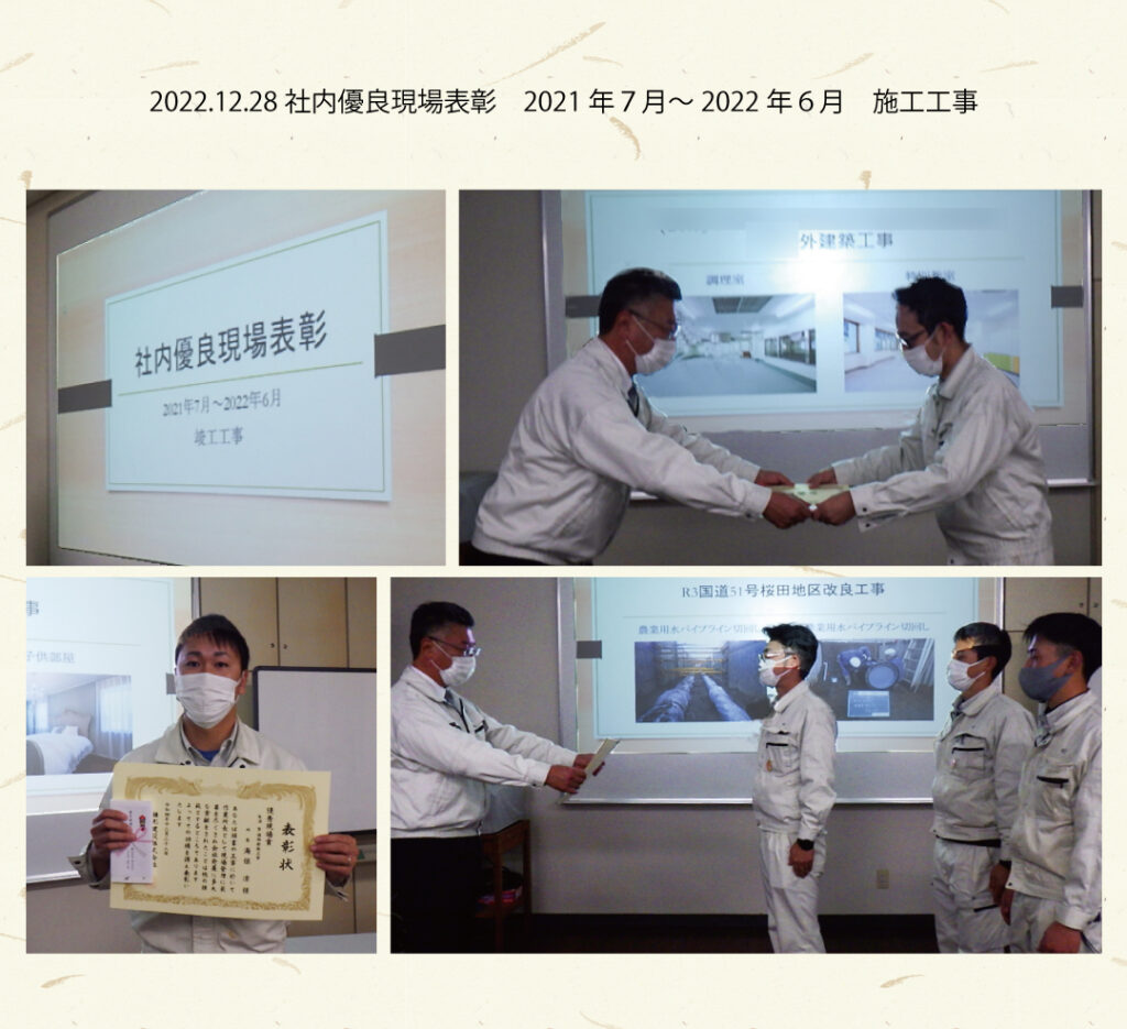 2022年12月28日に、社内優良現場表彰が、本社会議室にて行われました。2021年7月~2022年6月完成工事が対象になります。最優秀現場賞 土木部 柏尾所長、岩澤さん、大野さん優秀現場賞 セルコ事業部 海保所長、船津さん優秀現場賞 建築部 石川所長、佐藤さん受賞おめでとうございます。