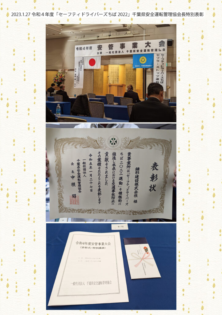 2023年1月27日、安管事業大会で、令和4年度「セーフティドライバーズちば2022」千葉県安全運転管理協会長特別表彰を受賞しました。
