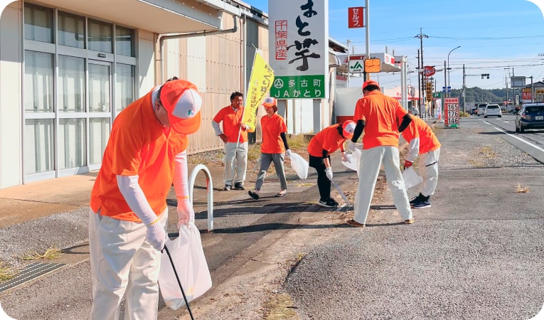 毎年2回、本社に近い国道296号沿いを中心に、町内の一斉清掃を実施しています。鎌形建設の活動フィールドであり、お客様が生活するエリアをきれいに快適にしたいとの思いから長年継続している活動です。巡回時には安全運転ののぼりを掲げ、ドライバーの方に交通安全を呼びかけています。