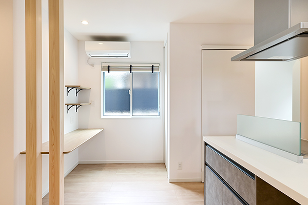 住み始めて約一か月経ちますが、設計士の和泉さんが方角にこだわって設計してくれた甲斐もあり、朝は東から日差しが入り、昼には南の玄関からいい光、風が入り、とても快適です。アドバイス通りにして良かったと思っています。 前の道路がかなりの車通りなのですが、南側に距離を作ったお陰で全く気になりません。また、ところどころコーディネーターの磯崎さんのアドバイスで曇りガラスを取り入れたのですが、外の目線も気にならず、大変快適です。 水回りは北側の方がいいと言われたのですが、それも良かったです。 基本的に、家具も余計なものを買わなくていいように備え付けの棚を多く盛り込みました。購入や搬入など余計なお金、時間もかかりません。収納や棚などはとても細かい所まで丁寧に打合せしていただきました。特に作業台が一番のお気に入りです。