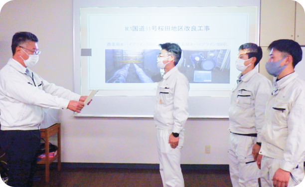 鎌形建設が手掛ける数多くの工事の中から、特に優秀な現場を受け持った担当者を年末の仕事納めに表彰します。施工管理の状況、安全面、仕上がりの品質、お客様の評価などを踏まえて優良現場を選出。表彰状と副賞が贈られます。