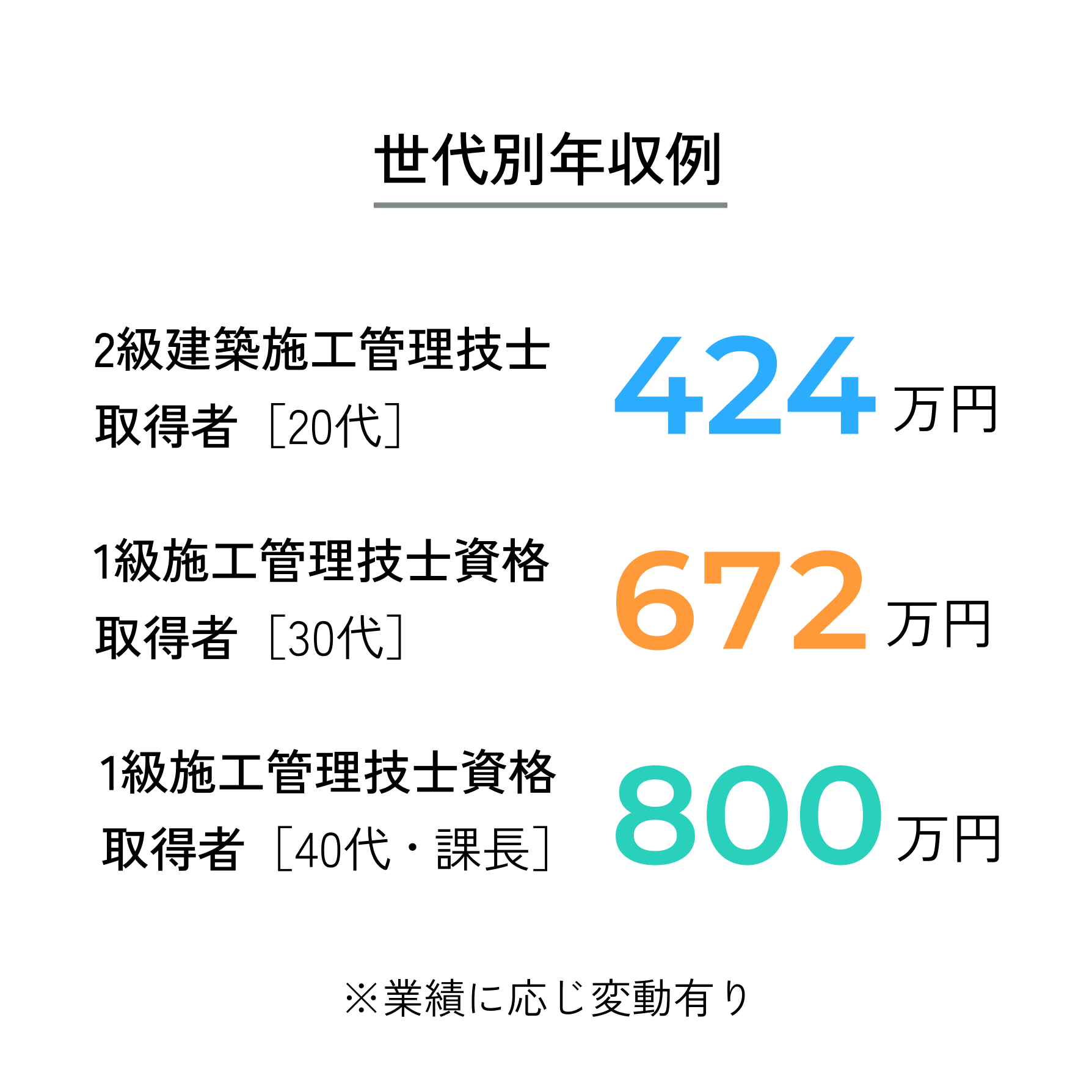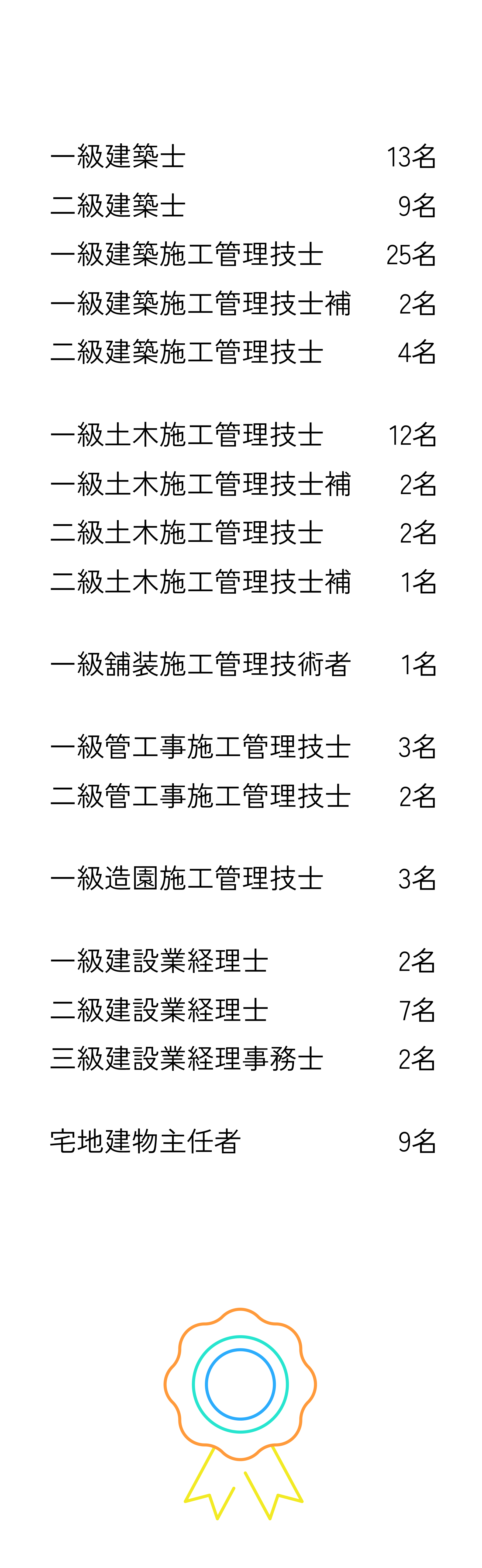建築士(2級・1級)/ 土木施工管理技士(2級・1級)/ 建築施工管理技士(2級・1級)/ 宅地建物取引士 / 建設業経理士(2級・1級) など