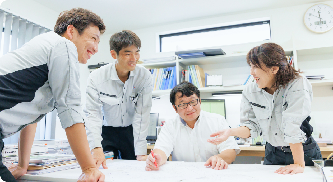 鎌形建設には、社員の成長と適切な評価を重視した社内制度、社員同士の交流を深めるイベント、安心して働ける福利厚生が充実しています。特に個人面談は1年間に3〜4回行われ、上司との対話を通じて悩みや不安を解消しながら仕事に向き合うことができます。