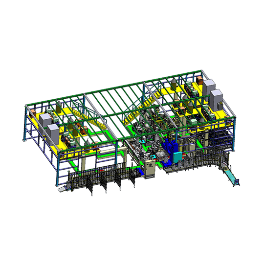 パレットをキャリア周囲に設置されたストッカにプ-ルし、M/Cとの受渡しを行うパレット搬送システムです。