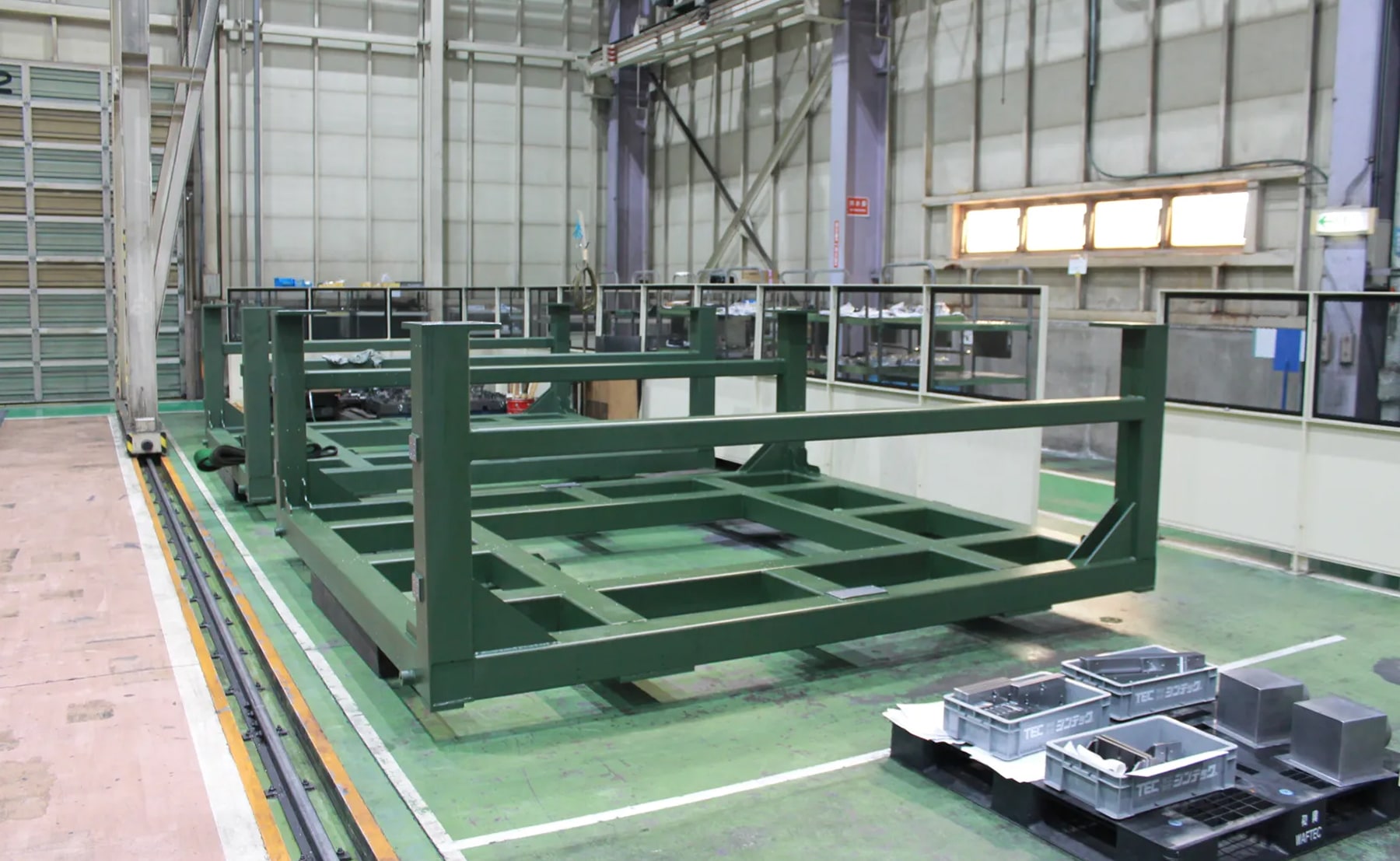 加工テ-ブル搬入出を行うパレット搬送システムです。